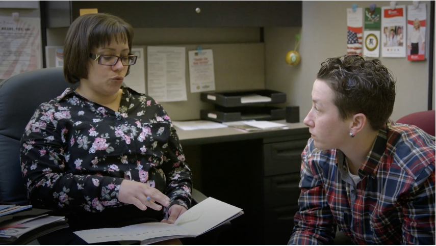 Screenshot from the "Behind on Bills" video showing the interaction between client and case manager that the booklet helps to facilitate. The video also shows the life-changing benefits that the booklet has had on this client's life.