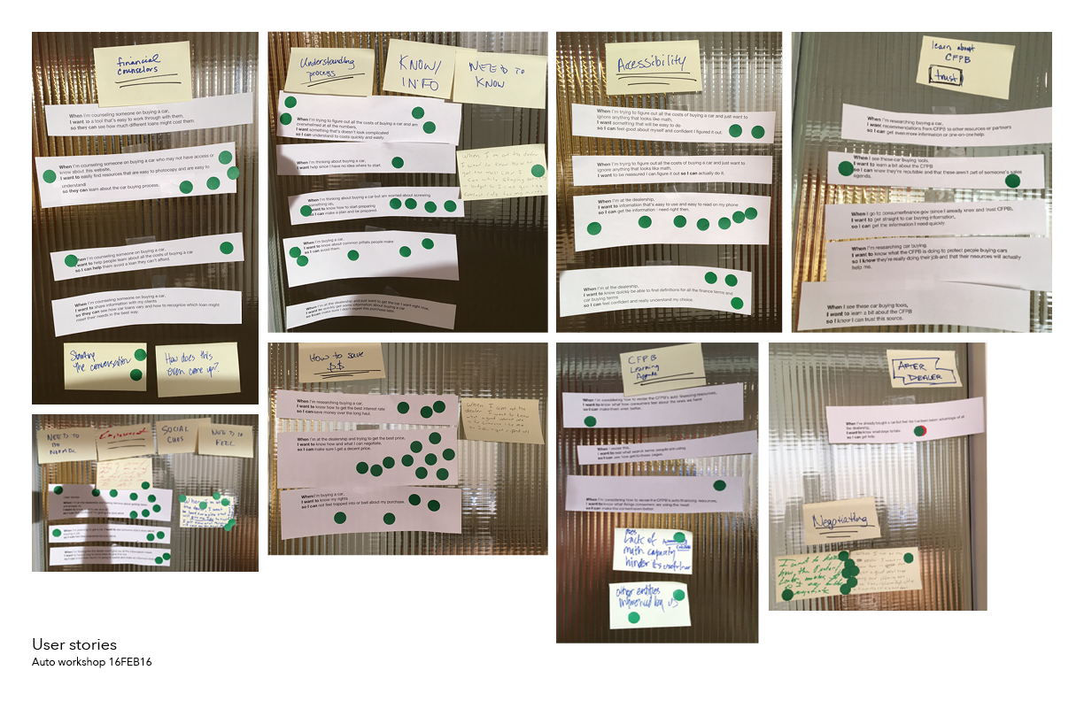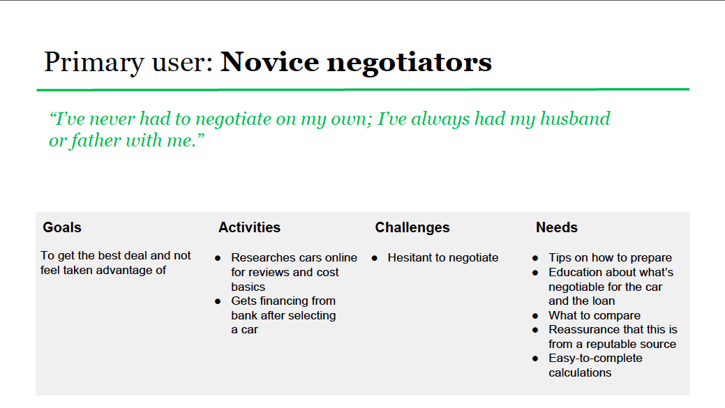 Personas: Based on my own informal discussions with car-buying friends and family, as well as research conducted by the Office of Financial Education, I created personas to identify some of the key activities, challenges and needs faced while shopping for a car loan.