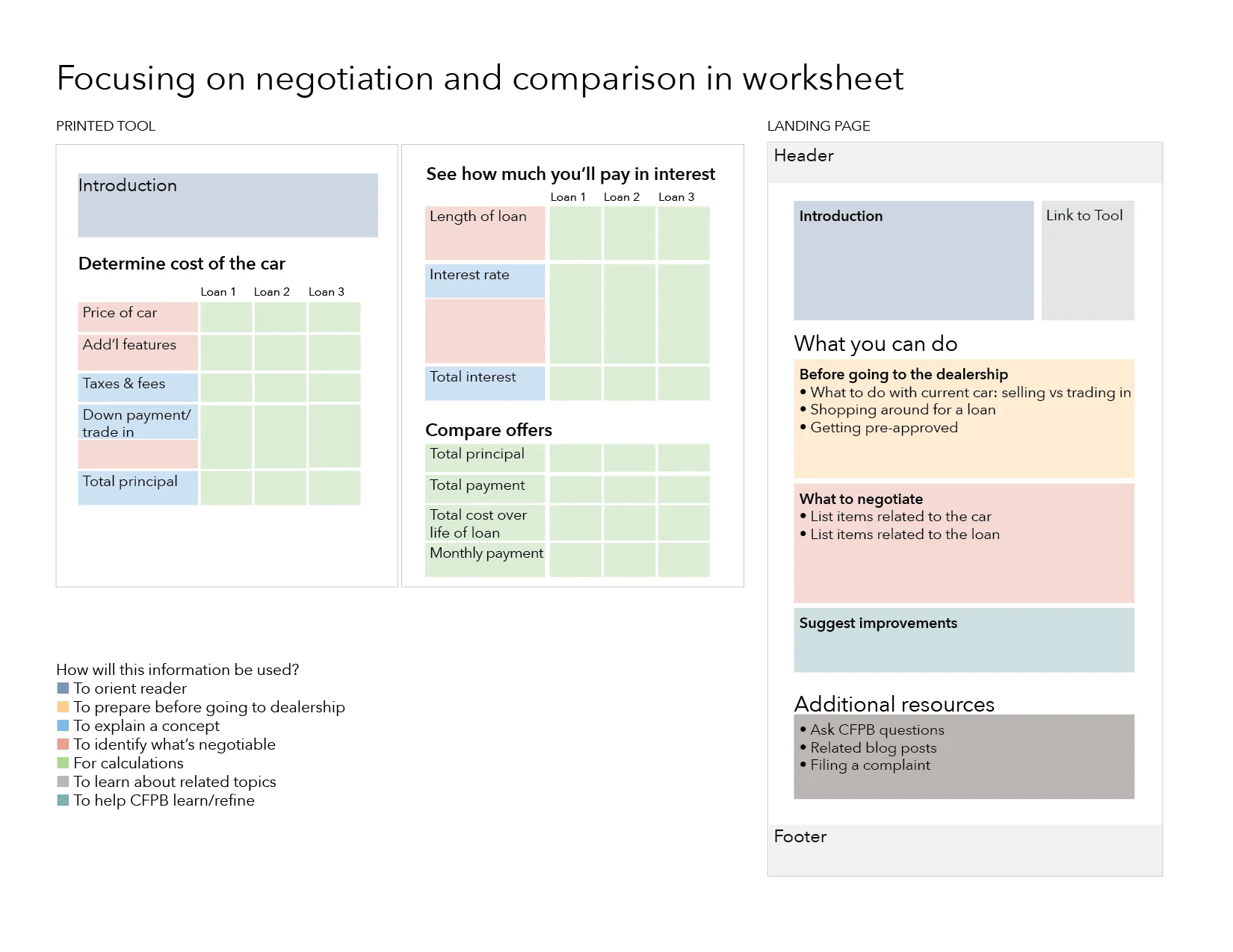 - A worksheet to help compare offers, calculate the total cost, and negotiate the best deal. We created a structure to make multiple math steps seem less intimidating; this was achieved by using both words and numerical examples to walk consumers through the math. The paper format was important since internet connectivity while shopping for a car may be limited, it helped consumers walk in looking prepared and confident, and it served as a low-tech and quick minimum viable product.