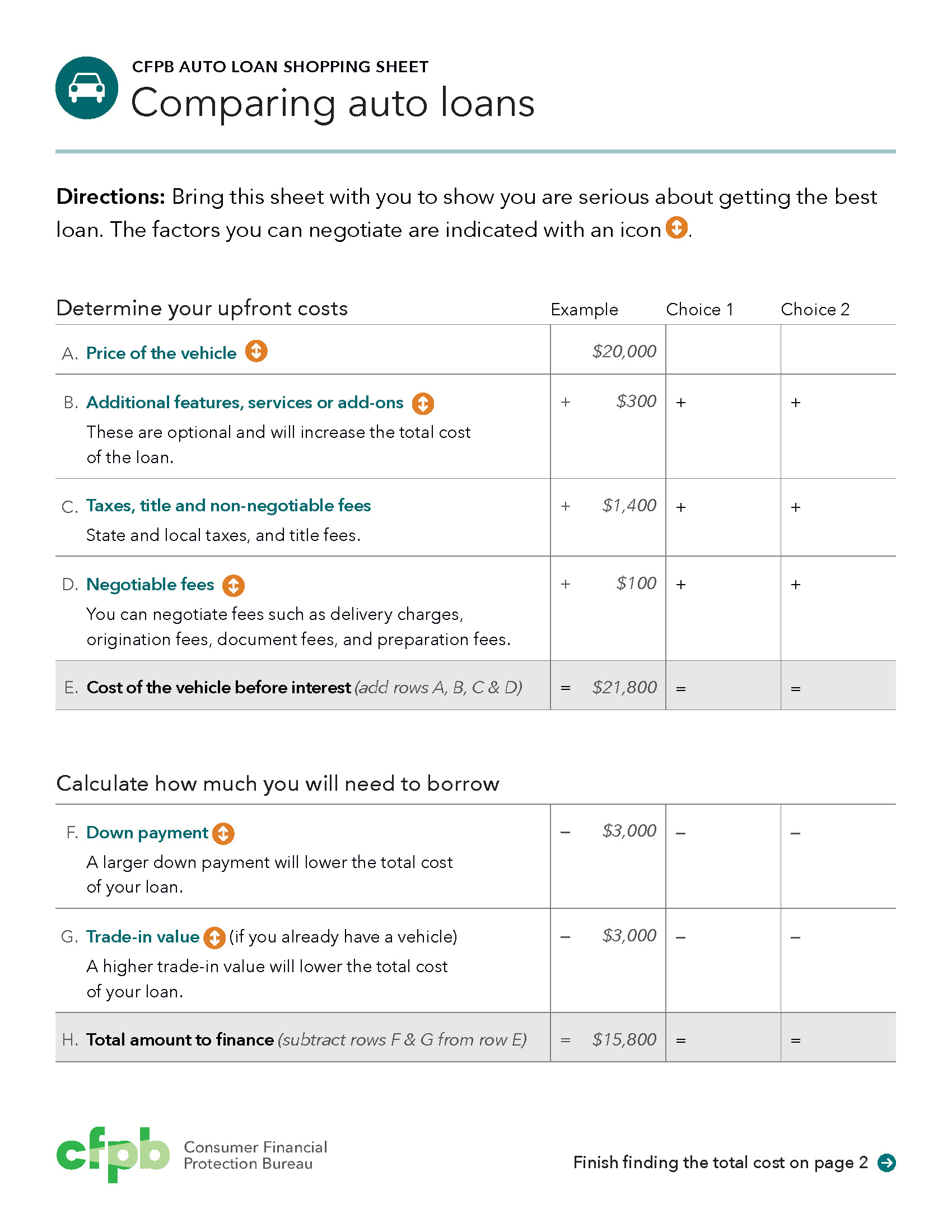 Final worksheet The first page walks consumers through calculating the cost of the vehicle and the amount they'll need to finance. The second page (not shown) helps them compare interest costs of various loans and the total they'll pay over the life of each loan.