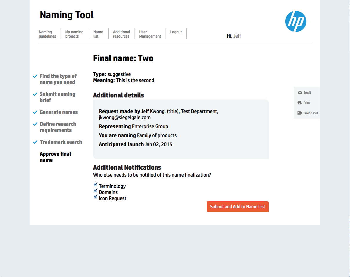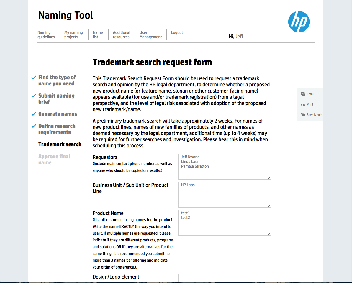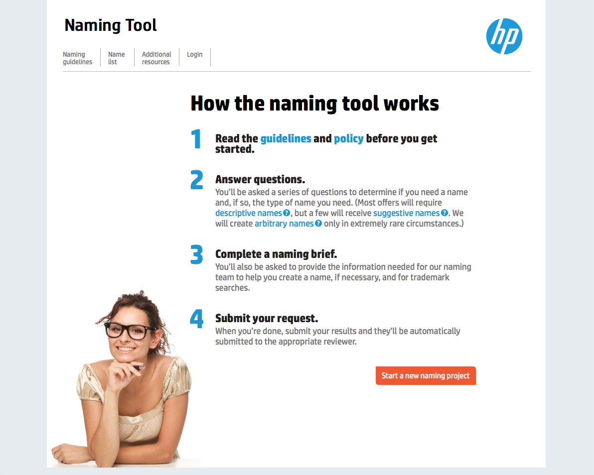 With these key points in mind, we developed a naming tool. Living on HP’s intranet, it’s easily accessible to all employees. Part database (it allows employees to cross reference against existing names), part decision-making tool (simple questions help employees reach the right name, which process is supplemented with tips and resources) and part communication tool (it provides workflow transparency and alerts stakeholders and approvers as needed), the naming tool empowers HP employees by simplifying the naming process and helping them get to the right name time and time again.